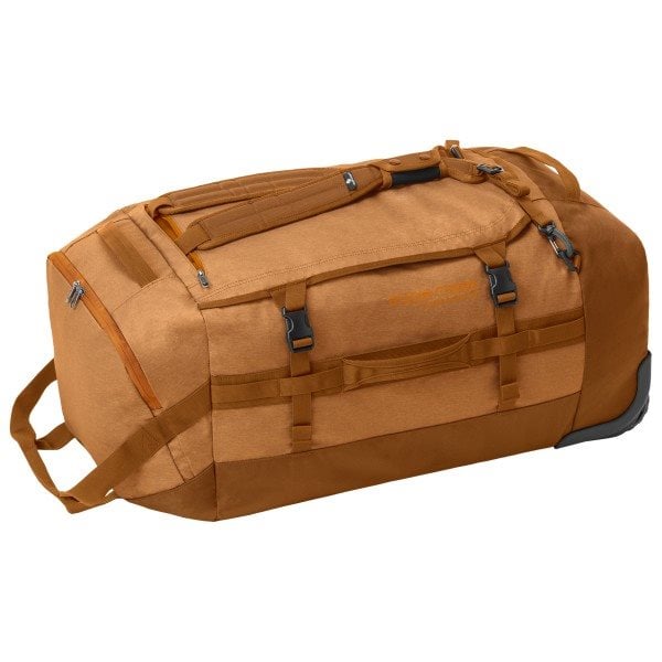 Uitgerust met een handgreep en wielen die oneffenheden gladstrijken, waardoor je zware ladingen moeiteloos over dokken, campings en voetbalvelden kunt vervoeren, vermindert deze reistas de inspanning aanzienlijk bij het sjouwen van vracht over korte afstanden. Schouderbanden en wegstopbare rugzakriemen bieden extra draagmogelijkheden, en verstevigde bevestigingspunten maken het mogelijk om de tas op een dakdrager of zadel te vervoeren. Wanneer de tas is opgeborgen, schuift hij in de meegeleverde opbergzak – die tevens dienstdoet als pakzak.